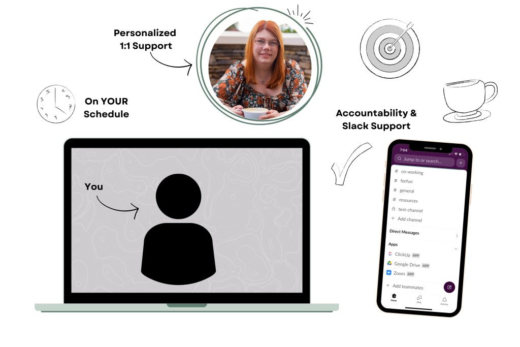 Perfect! Many of my clients are introverts who chose entrepreneurship or content creation specifically for the autonomy. All our calls are 1:1, and I respect your need for processing time and space. The Slack support is there when you need it, not as constant interruption.